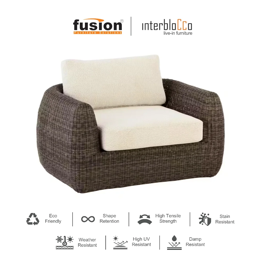 The cushions are upholstered in soft, textured Olefin fabric, known for its weather resistance and luxurious feel. Plush high-density foam padding ensures exceptional comfort, making it perfect for long hours of relaxation. The dark brown wicker paired with light Olefin fabric creates a stunning contrast that enhances the aesthetic of any outdoor space.
